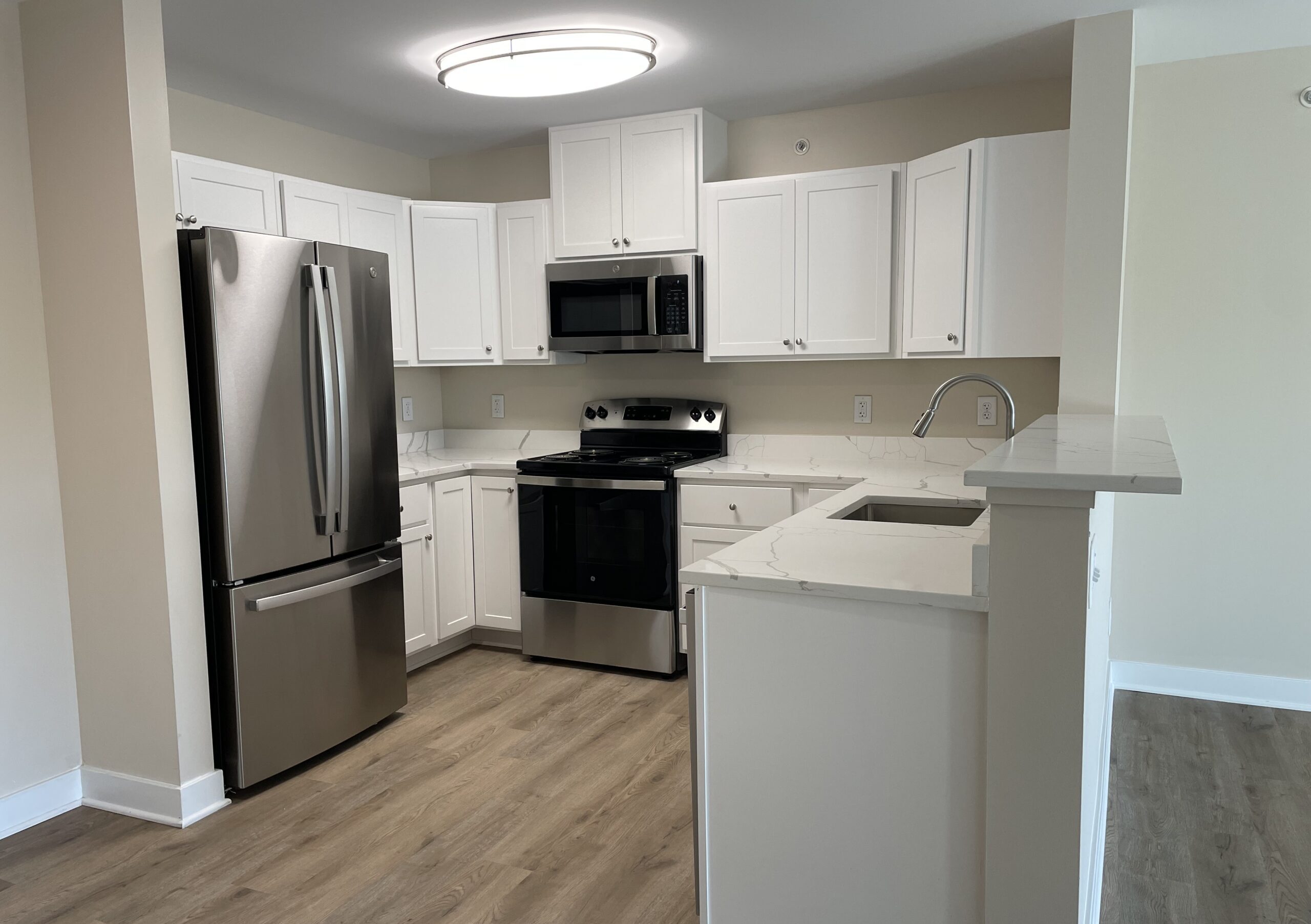 The new mixed-use building combines ground-floor commercial space with senior living apartments above for residents aged 62 and older. The residential portion includes 87 units, with a mix of 28 two-bedroom and 59 one-bedroom apartments. Each unit is designed for a comfortable flow and plenty of natural light.